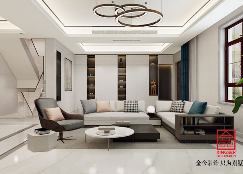 客廳空間拆除墻體,精致的家具陳設(shè)雕塑感極強,仿佛動態(tài)與靜態(tài)可隨時轉(zhuǎn)換。暖棕、素灰,亮白互相穿插相融,沙發(fā)、茶幾、邊椅圓潤邊角線敦厚,共同營造出一方自在閑適。空間由看似隨性卻富有條理性的線面鋪開,豐富的自然采光消融現(xiàn)代材質(zhì)的冰冷。電視墻面轉(zhuǎn)換為往上延伸的懸空視覺效果,弱化原本較低的層高局限。空間形態(tài)達到輕柔平展,多元嶄新的面貌被逐一喚醒。