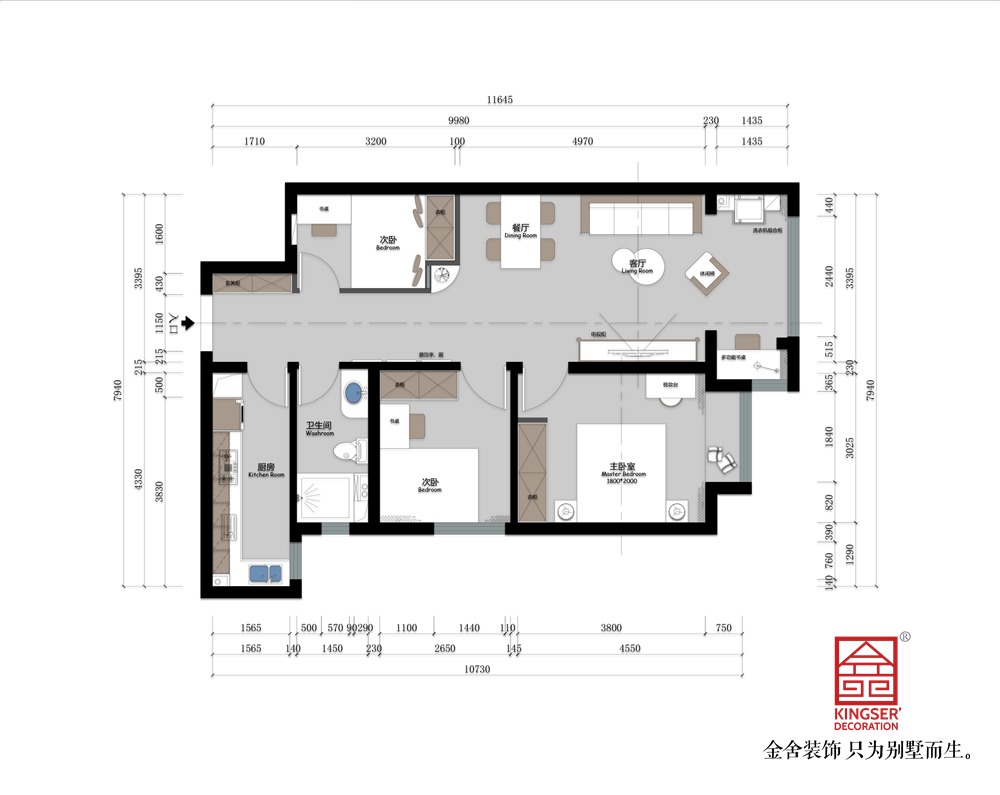 2.新建隔墻實現(xiàn)三室需求并滿足餐邊柜功能需求。