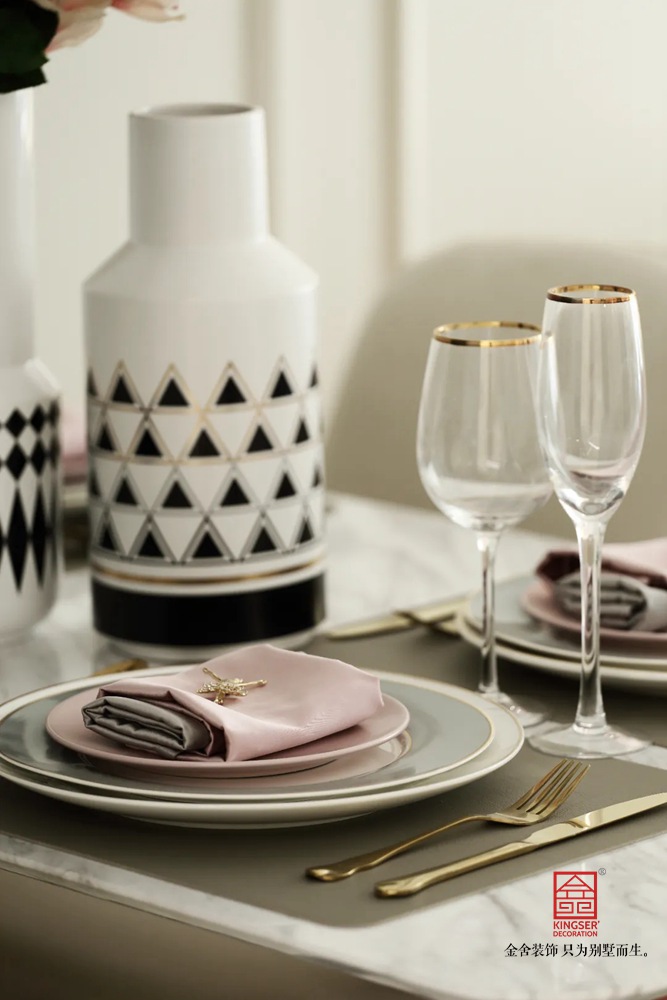 餐桌上配有輕奢風(fēng)格的花瓶和餐具,提升房間的華麗氣質(zhì),讓空間不再單調(diào)。白色與橘紅配色的餐邊椅也讓整個(gè)空間看起來更具時(shí)尚的溫度。