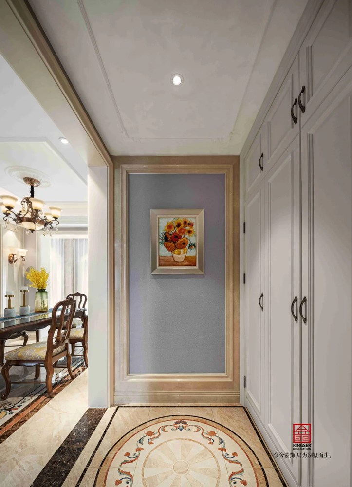 門廳位置透過設計師的設計來凸顯歐式的純然風情及深厚的文化底蘊,走廊間色調柔和,給人高貴舒適的感受,地面拼花為簡潔的地板起點綴作用,梵高的向日葵掛畫彰顯業(yè)主品位。