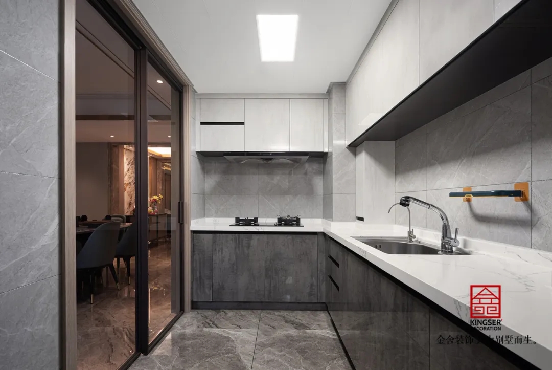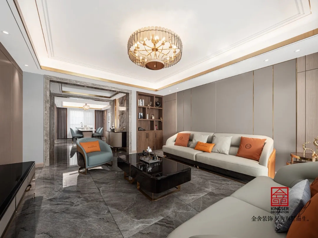 此案例為石家莊金舍裝飾-東南智匯城191平米輕奢風(fēng)格裝修實(shí)景。灰色寧?kù)o似夜,橙色活力迷人,優(yōu)雅低調(diào)的灰色,給人以夜的寧?kù)o,是包羅萬(wàn)象的,可以與任何顏色協(xié)調(diào)。橙色恰如冬日里的陽(yáng)光,可以是快樂(lè)愉悅的,又透出一絲深秋的憂傷。