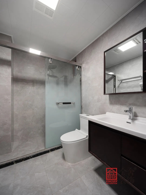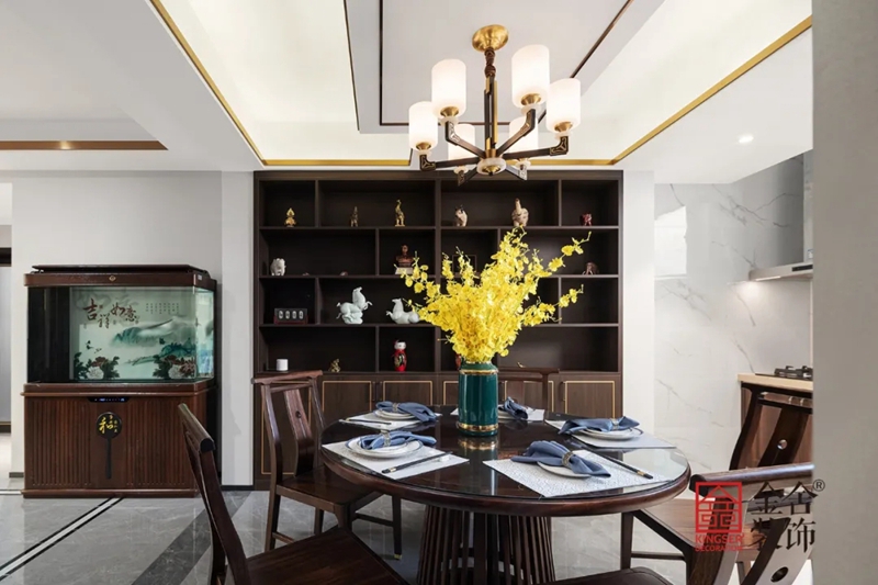 詩如明月,飛波揚彩;明月如詩,玉潤冰清??蛷d沙發背景墻的圓形裝飾就如同一輪皎皎于天際的明月,暈染了整個空間,唯美之感頓生。電視墻對稱的花格設計突出了傳統中式的風范,古典精致的空間不失通透靈動的氣質,山水感十足大理石與造型古樸的壁燈結合,穩重大氣。色彩濃厚的軟裝配飾在這魅力的客廳里,隨性地揮灑出沉穩的古樸之美。
