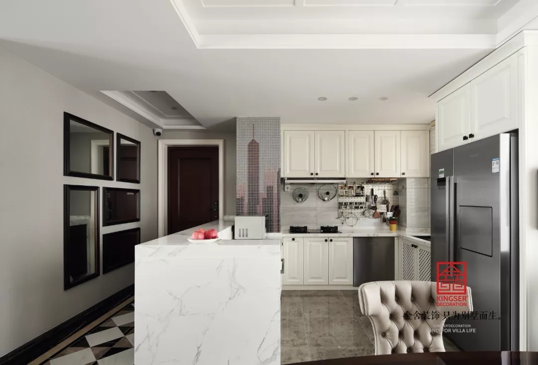 廚房采用的是開放的西廚式設(shè)計(jì),不算很大的空間內(nèi)將所有的電器及其他廚房設(shè)施都安排得井井有條,剪影一般的畫作讓這個(gè)空間多出一份夢幻的色彩。