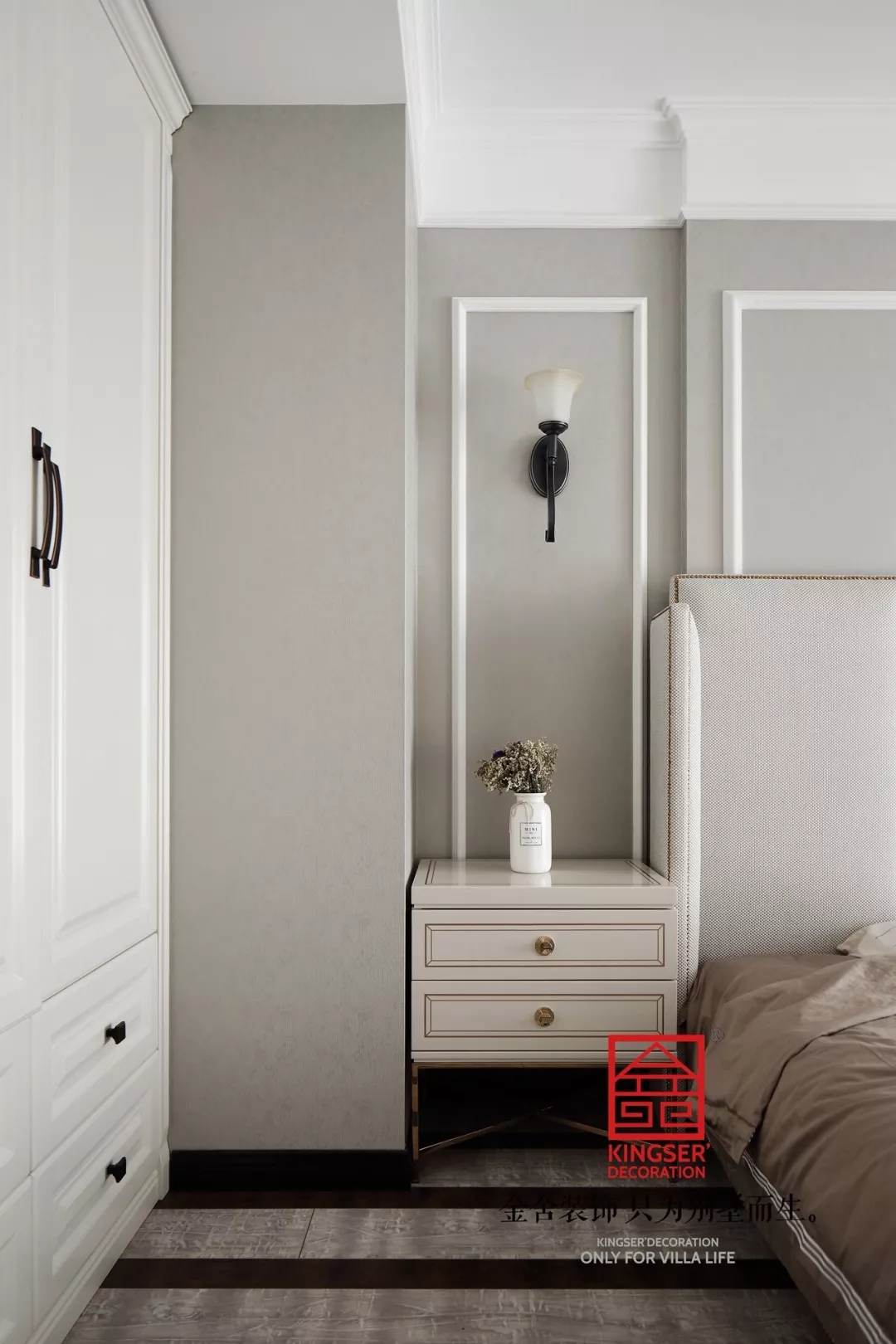 整個(gè)臥室為灰色基調(diào)的細(xì)節(jié)里加入鮮活的軟裝布藝,在端莊沉穩(wěn)的空間里,點(diǎn)亮了溫馨的氣息,細(xì)膩綿軟的感覺瞬間在空間中炸裂,讓處在空間中的人都能體會(huì)到臥室給予使用者的無限舒適。