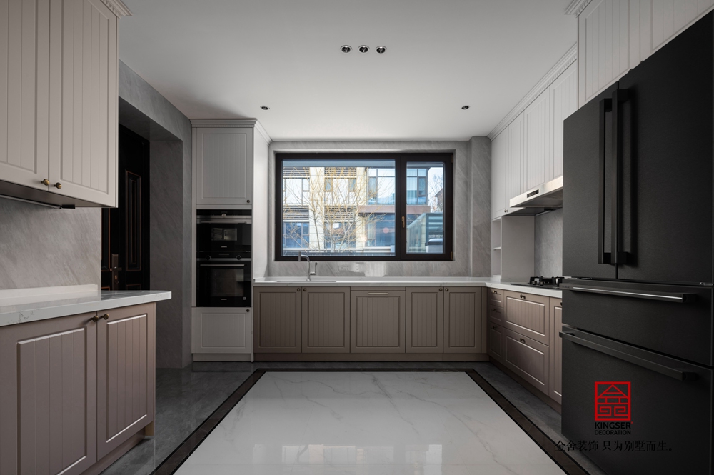 巧妙地融合了餐廳與廚房的空間,創造了一個開放而又不失獨立性的餐廚一體化區域。這一設計理念旨在讓烹飪與用餐的體驗更加流暢,同時也增強了家人與朋友之間的互動。餐廚空間的中心位置,我們精心打造了一個巖板中島臺。中島臺不僅作為廚房的操作臺,還充當了餐廳與廚房之間的自然分隔,既保證了兩個空間的獨立性,又確保了視線的通透與流動。
