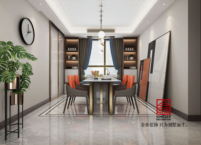 客廳造型別致的幾何茶幾組合與暖橙色單人沙發(fā)的搭配,讓空間在低調(diào)的氛圍中滋生少許精致的美感。餐廳是客廳美感的延續(xù),島臺與餐桌的結(jié)合讓空間更飽滿,功能性也進(jìn)一步提升。黑白對比分明的色調(diào),凸顯高級質(zhì)感。極簡的吊燈帶來的不僅是明亮的光線,更是生活中不可缺失的小情調(diào)。