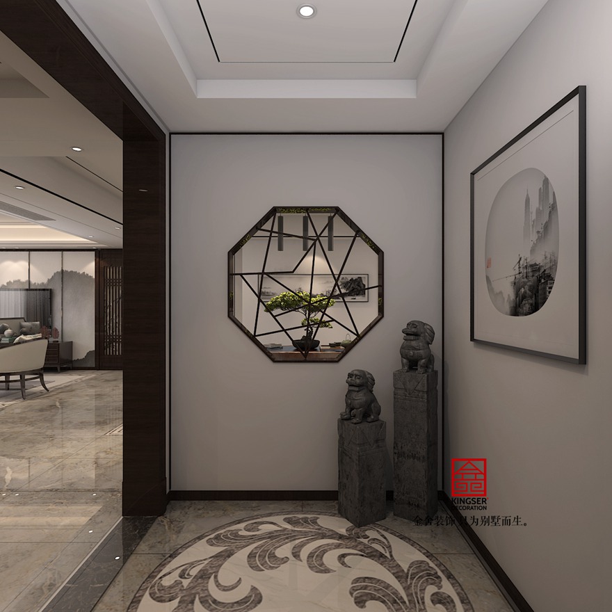 整體的色調以黑白灰為主,根據(jù)需求從新劃分功能空間,并參考了中式園林里面的造景手法,達到室內空間的“一步一景”。入戶玄關位置把原有的墻面做了一些拆改,透過中式八角窗,映入眼簾是茶室桌面上的盆景,兩個石獅子也體現(xiàn)了充分的中式元素。錯落的竹節(jié)燈,不僅起到了照明的作用,也有著著節(jié)節(jié)高升的寓意。家具造型簡約,采用棉麻、·胡桃木、金屬等材質打造空間內的氣質元素,與香道飾品完美融合,收放自如的詮釋了東方的精髓,讓人倍感上流社會的優(yōu)雅與品味。