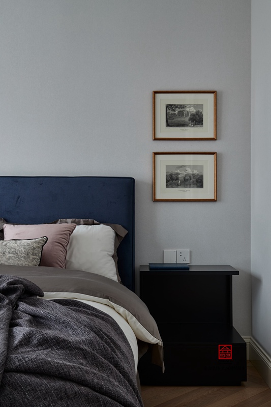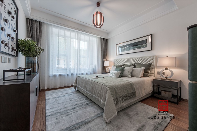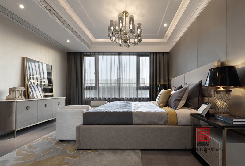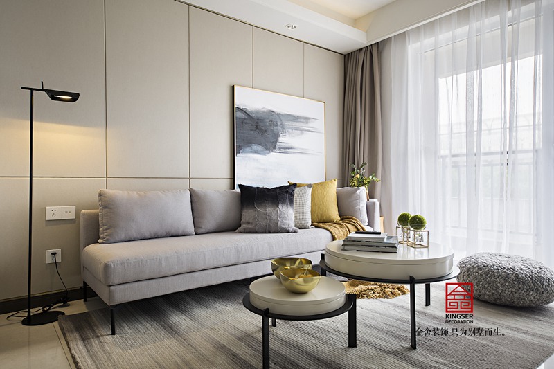 在這套現代簡約高級灰裝修設計說明案例中,走進客廳的一瞬間仿佛是進入了一個藝術畫廊,充滿了東方意境,散發出獨特的韻味。漸變的灰色沙發背景墻,呈現出飄逸流暢的視覺效果。