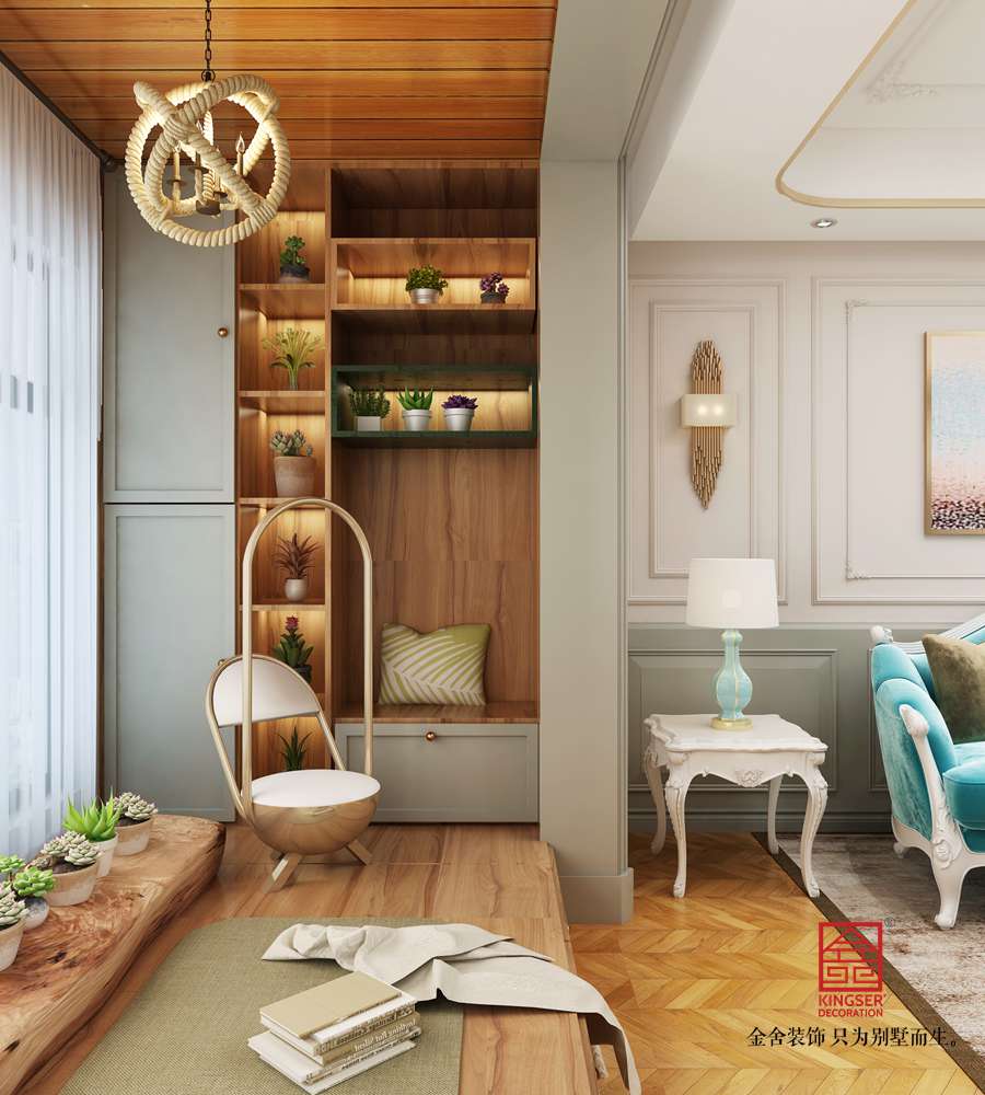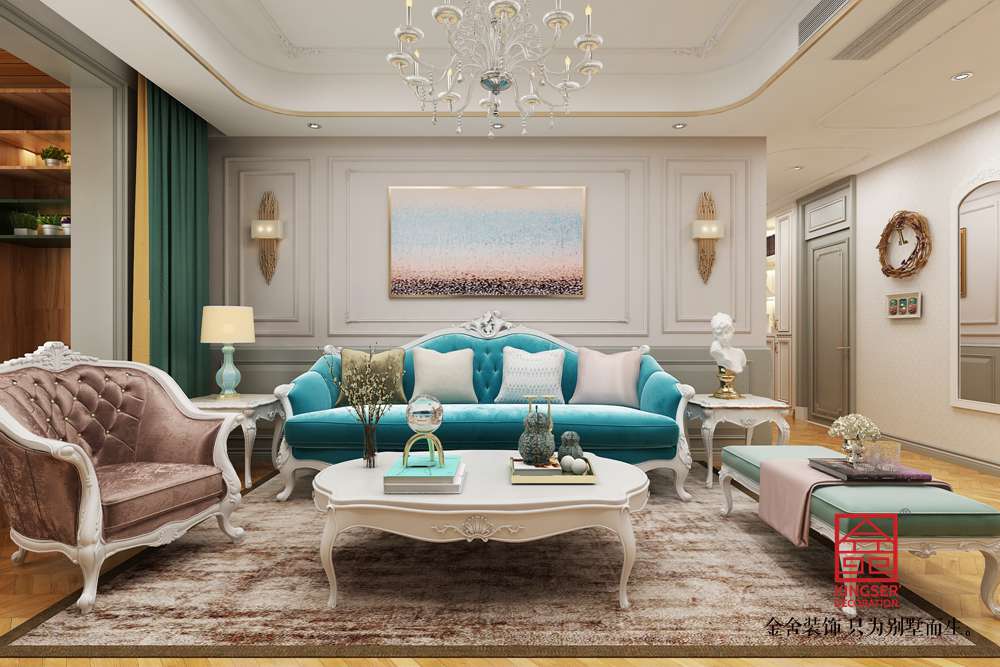 設(shè)計(jì)說明:此案例為石家莊金舍裝飾-東南智匯城126平米法式輕奢風(fēng)格裝修效果圖。藍(lán)色系具有立體感的沙發(fā)顏色,使墻面很顯層次感;多彩的地毯、靈動(dòng)設(shè)計(jì)的臺(tái)燈、不拘一格的掛畫,營造出一幅自由、溫馨、浪漫的氛圍;而客廳旁的落地窗給足了這間空間明亮的自然采光,用餐區(qū)域餐桌上方的水晶吊燈與客廳中的精致吊燈遙相呼應(yīng),讓整個(gè)空間之中都映射出一種浪漫氛圍,法式風(fēng)格如同法國這個(gè)國家一樣,浪漫迷人,仿佛普羅旺斯的陽光,灑滿你的家。藍(lán)色調(diào)營造浪漫時(shí)尚法式風(fēng)情,尋求心靈的自然回歸感;將法式傳統(tǒng)的三顏色與當(dāng)季流行色融合,不失法式的貴氣和浪漫