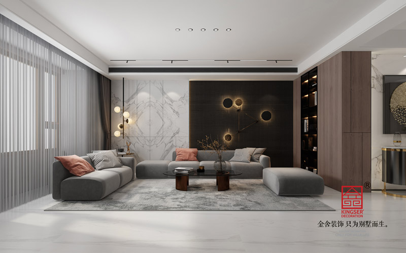 榮盛華府裝修設計200平現代風格案例,現代風格外形簡潔、功能強,強調室內空間形態和物件的單一性、抽象性。現代簡約風格,顧名思義,就是讓所有的細節看上去都是非常簡潔的。裝修中極簡便是讓空間看上去非常簡潔,大氣。裝飾的部位要少,但是在顏色和布局上,在裝修材料的選擇配搭上需要費很大的勁,這是一種境界,不是普通設計師能夠設計出來的。