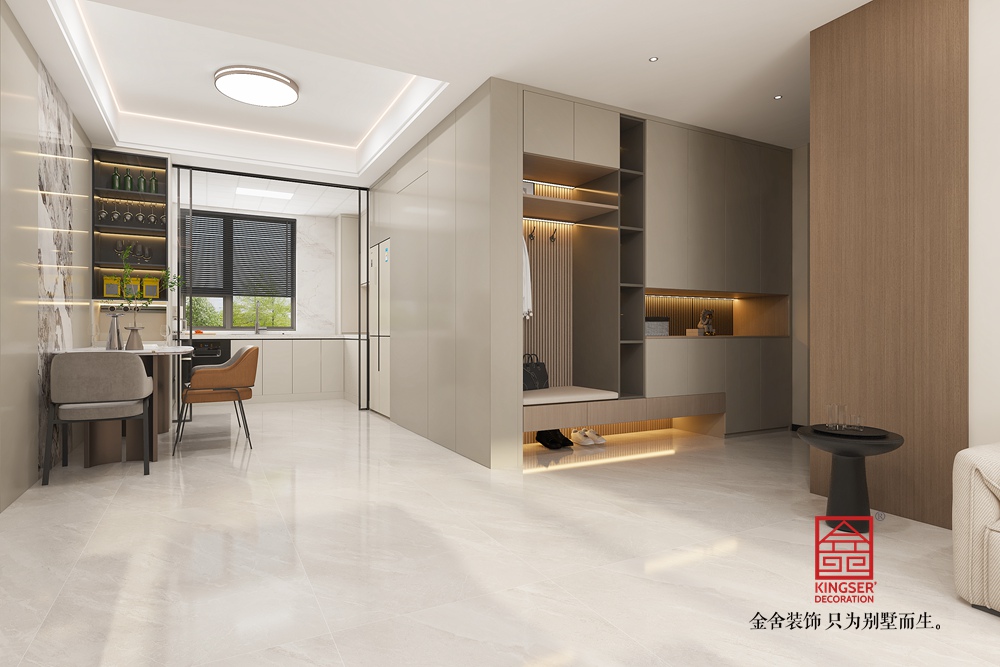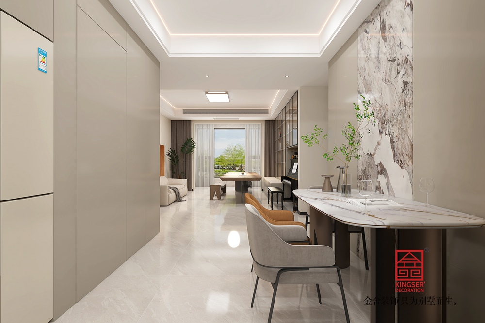 材質上,原木的自然質感、大理石的光潔以及金屬的精致相互融合,層次豐富。燈光設計巧妙,嵌入式燈帶與頂燈營造出柔和均勻的光照,凸顯空間通透感。整體設計摒棄傳統客廳的刻板,以實用與美學兼具的布局,為居者帶來更具個性與深度的生活體驗,詮釋了去客廳化設計對生活方式的創新與升級。